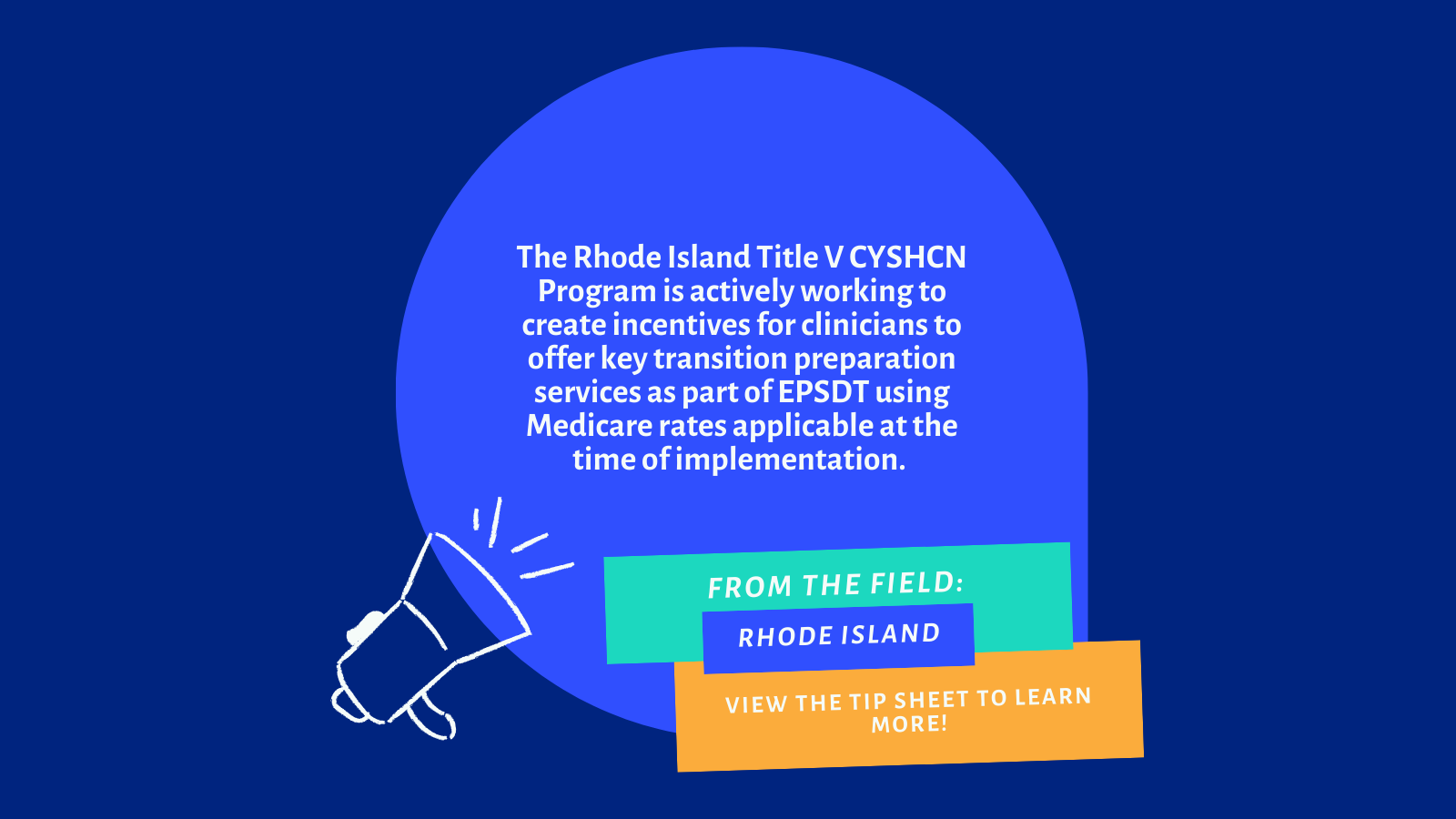 The Rhode Island Title V CYSHCN Program is actively working to create incentives for clinicians to offer key transition preparation services as part of Early and Periodic, Screening, Diagnosis, and Treatment (EPSDT) using Medicare rates applicable at the time of implementation. These services will include readiness assessments, education/counseling, medical summary preparation, and, for youth with serious medical/developmental/behavioral/social needs, joint telehealth visits. Guidance will be provided to managed care organizations (MCOs) and clinicians about this new payment opportunity, alongside plans to explore a health care transition (HCT)/EPSDT performance improvement project to enhance transition-related care. For more information, view the tip sheet developed by The National Alliance to Advance Adolescent Health/Got Transition titled, Paying For Health Care Transition Services Under Medicaid’s Early and Periodic, Screening, Diagnosis, and Treatment (EPSDT) Benefit: Rhode Island State Example or Contact Us.