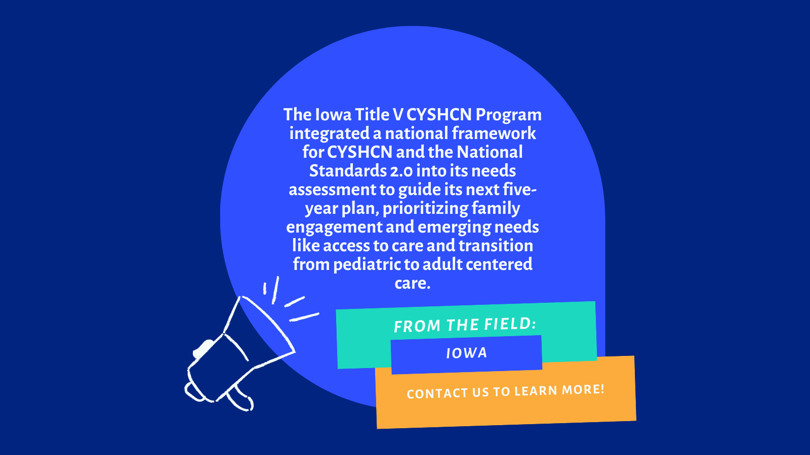 The Iowa Title V CYSHCN Program integrated a national framework for CYSHCN and the National Standards for Systems of Care for Children and Youth with Special Health Care Needs Version 2.0 into its needs assessment process to guide its next five-year action plan. Data collection was structured around a national framework for CYSHCN with analysis and reporting aligned to the National Standards for a System of Services for CYSHCN. The Iowa team identified priorities that aligned with the National Standards for the system of care for CYSHCN, including affordable insurance coverage, and evidence-based care, along with core domains tailored to emerging needs within their state, such as access to care, medical home, community-based services and supports, and transition from pediatric to adult-centered care. This approach offers a practical framework for prioritizing goals, objectives, and strategies. To learn how this comprehensive approach can support other state Title V programs in planning and tracking progress effectively, please  Contact Us.