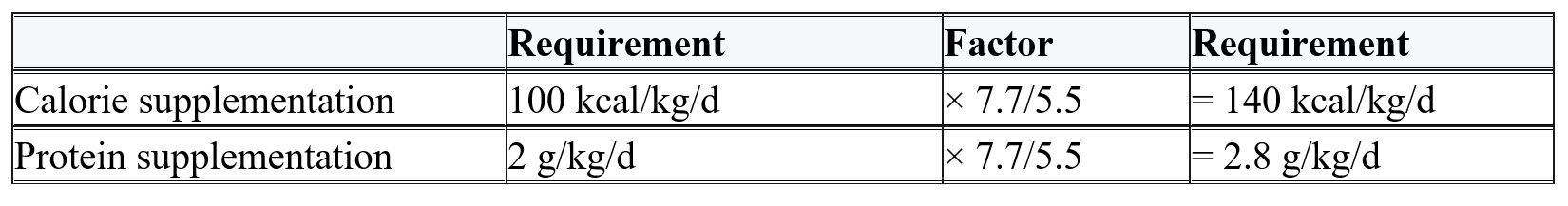 Phase 2: If phase 1 is well tolerated, increase intake to provide adequate nutrition to achieve catch-up growth. Multiplying the age-adjusted energy requirements (kcal/kg/d) by the ratio of the newborn’s or infant’s ideal body weight for height divided by their actual body weight at presentation generates a reasonable estimate. Usually the energy and protein requirements can be accomplished with the use of a routine infant formula modified to increase its caloric density.