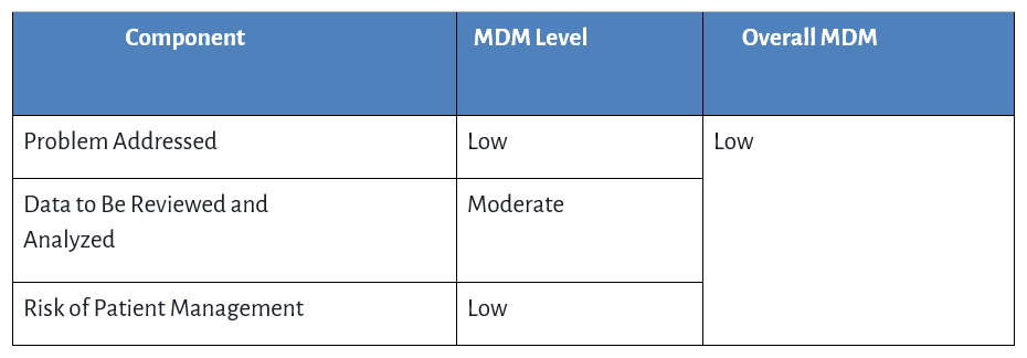The level of MDM applies separately to each of the MDM components. You are required to have 2 of the 3 components reach a level of MDM to report a given code.