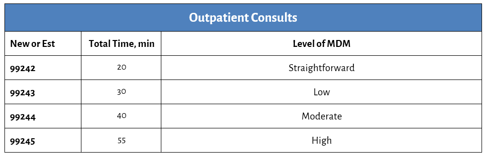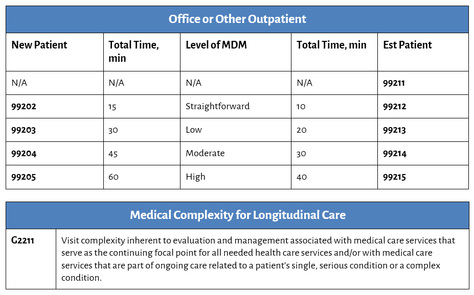 Coding of evaluation and management (E/M) services continues to be the most asked-about coding topic on the coding and payment hotline. Medical Decision Making (MDM) and total time concepts have been applied to the majority of E/M code sets. Understanding how to apply CPT guidelines to code selection will help you to write meaningful documentation that will support both the medical necessity of the service you provide and the CPT codes you report for payment.