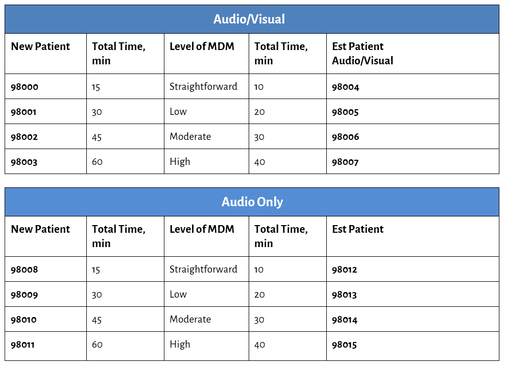 Note: Visits reported with these codes do not have specific telemedicine codes and should have a 93 modifier (audio only) or 95 modifier (audio-visual) appended to the E/M code.