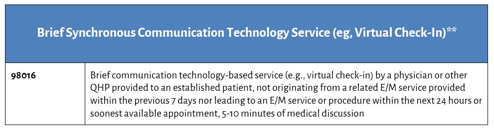 This code is an add on to codes 99202 – 99215. Refer to our factsheet for additional coding and payment resources