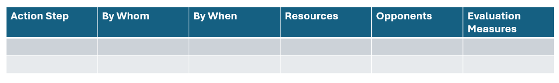 Below is an example of how you can track your action steps and include potential measurements as you go. Don’t forget to credit your community as you share outcomes of project work. Use your media skills to help disseminate the success!