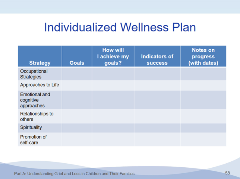 For more information, view the “Resilience Curriculum: Resilience in the Face of Grief and Loss,” developed by the AAP Section on Hospice and Palliative Medicine. Part D of the curriculum, “Introduction to Personal Wellness” includes a number of resources for physician wellness.”
