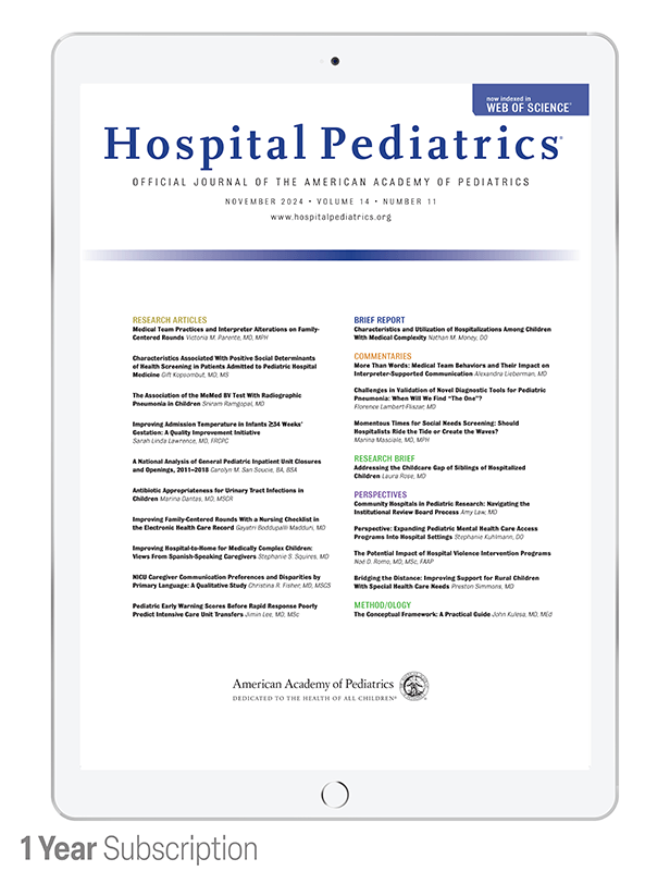 Receive bonus monthly eTOC alerts announcing new issues, Hospital Pediatrics Journal insights emails, and Blog posts by Editors and special guests.