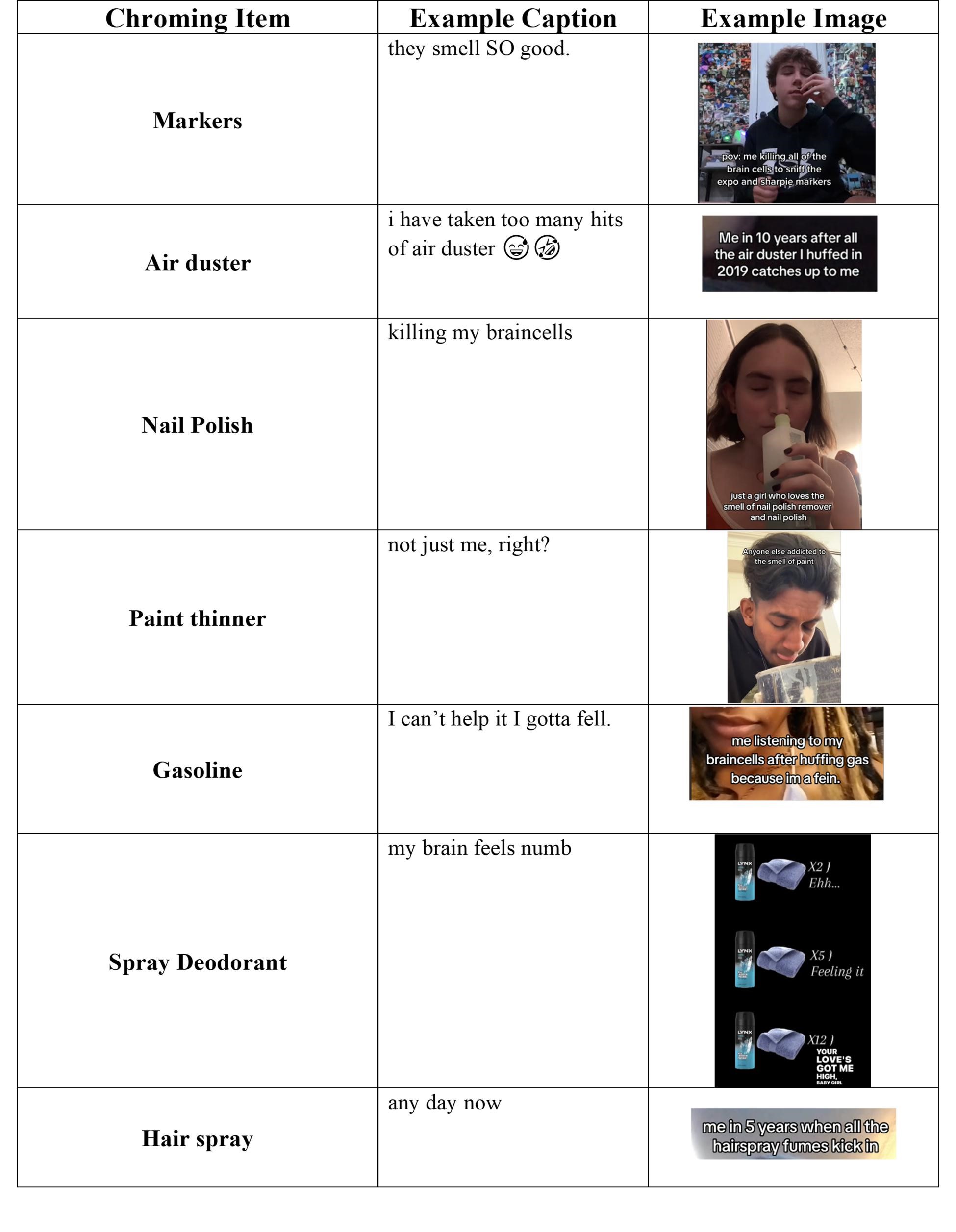 “Chroming”, also known as “huffing,” is the act of inhaling toxic fumes from household items such as nail polish remover, permanent markers, and/or aerosol deodorant. Chroming typically produces a short euphoric state which creates a high potential for repeated usage and addiction. Inhalant abuse can lead to dizziness, brain damage, and even death. While chroming isn't a new activity for adolescents, it has resurged with the help of social media apps. TikTok is one such social media platform with children aged 10-19 as its largest user demographic. This study examines chroming-related content on TikTok in order to educate pediatricians on teen usage.