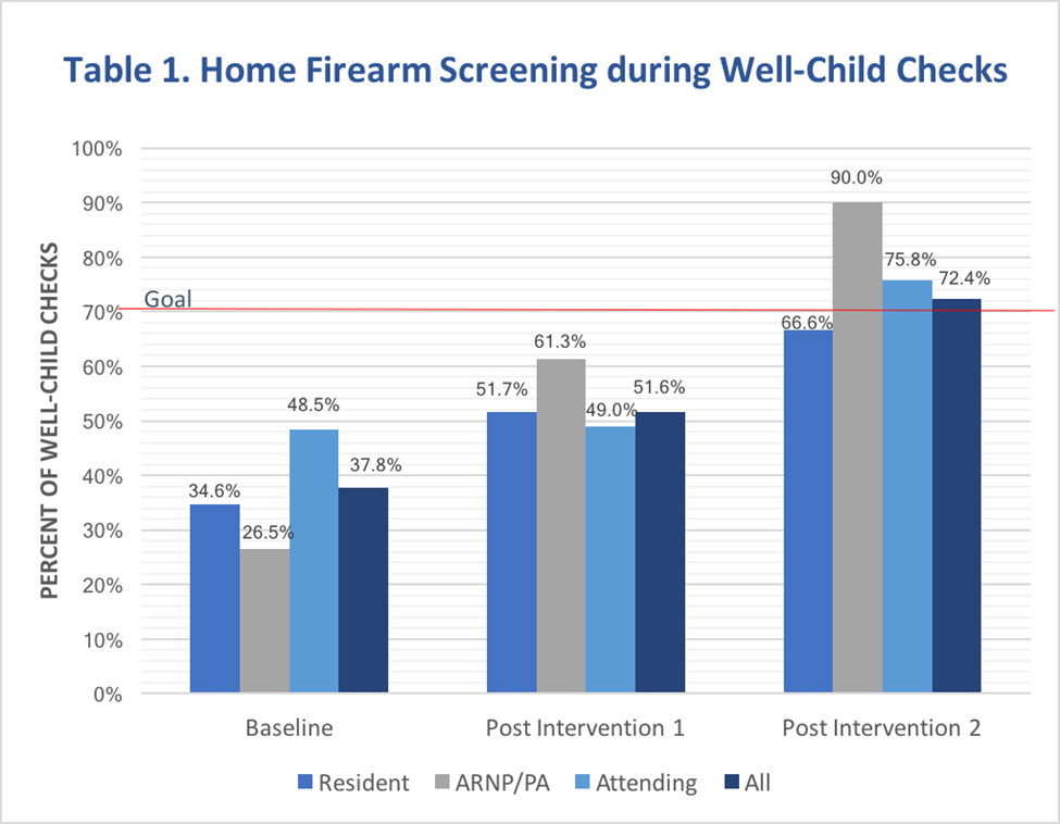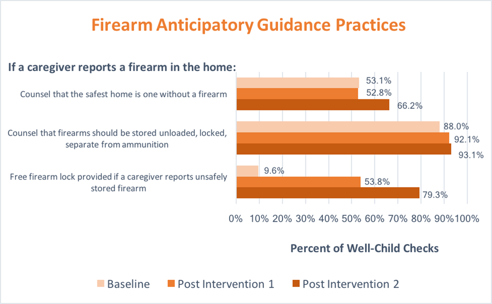 Background: Firearms are the leading cause of death in American children and adolescents. The American Academy of Pediatrics (AAP) recommends that pediatricians ask about the presence of firearms in the home at well-child visits and advises that homes without firearms provide the most effective measure to prevent firearm-related injuries. The AAP recommends safe storage for homes with guns. Despite these recommendations, pediatrician firearm screening remains low. A recent randomized control trial found a significant increase in safe firearm storage when pediatricians provided free firearm locks and counseled on firearm removal and safe storage. Objective: Increase firearm screening (asking about home firearms) from roughly 40% to 70% and also increase counseling on firearm removal, safe storage and provision of free firearm locks during pediatric well-child checks over eight months.