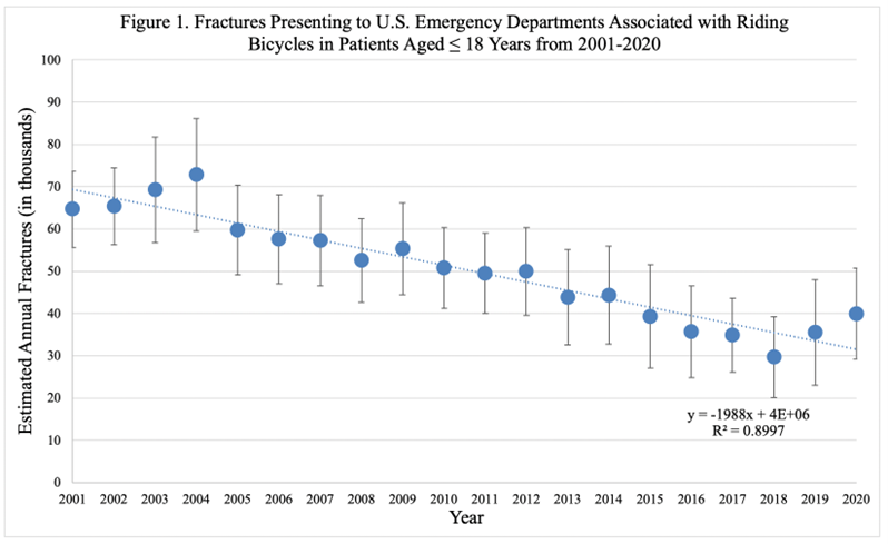 While the number of fractures from children riding bicycles has decreased over the past two decades, researchers noted an increase in fractures in 2020 that is consistent with literature showing a significant increase in other injuries during the COVID-19 pandemic. This is potentially due to an increased use of bicycles from stay-at-home orders and cancellation of school and summer camps.