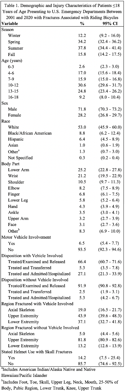Demographic and Injury Characteristics of Patients ≤ 18 Years of Age Presenting to U.S. Emergency Departments Between 2001 and 2020 with Fractures Associated with Riding Bicycles
