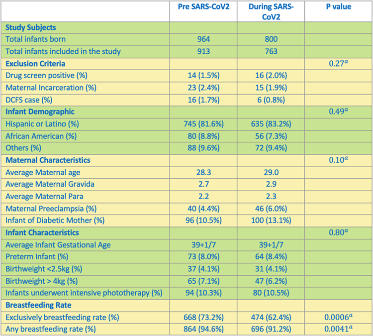 Of the 964 newborns screened in the pre-SARS-CoV-2 cohort, 913 were included. Of the 800 screened during-SARS-CoV-2 cohort, 763 newborns were included. There were no significant differences in the demographics between the two cohorts (Table 1). We found a 11% decrease in the rate of exclusive breastfeeding (p < 0.05) and a 4% decrease in any breastfeeding (p < 0.05) during the SARS-CoV-2 period (Image 1).