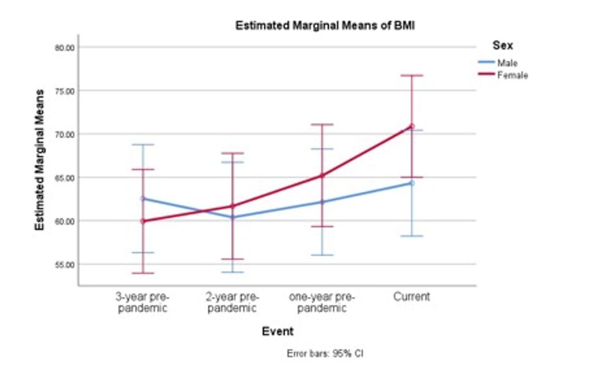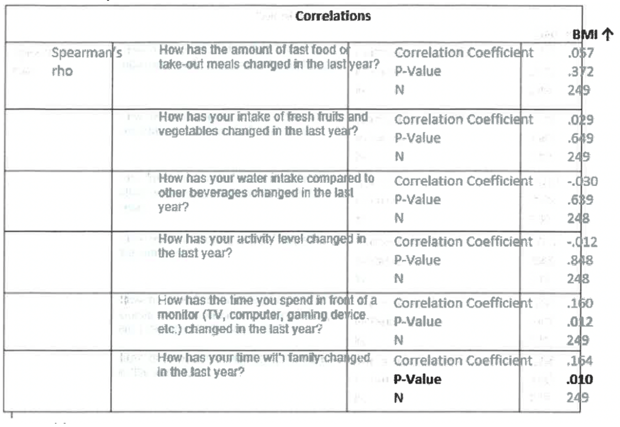 Patients between the ages of 4 and 17, seen for >2 years and having recorded BMIs for at least 2 visits separated by one year, were enrolled at General Academic Pediatric (GAP) at Children’s Hospital of The King’s Daughters (CHKD) in Norfolk, VA during their well check. Consented patients over the age of 8 and parents/guardians were administered a questionnaire that examined six different potential sources for lifestyle changes that could impact BMI. Generalized Estimating Equation (GEE) model and Spearman correlation were utilized for statistical analyses between variables. Data was collected from 238 patients (51% female identifying, 49% male identifying; majority African-American/Black) with an average age of 9.47 for females and 9.57 for males.