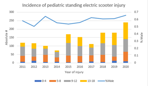 ANAHEIM, CA.-- Standing electric scooters, commonly referred to as e-scooters, have been increasing in popularity across the country over the past decade. According to a new research abstract presented during the 2022 American Academy of Pediatrics National Conference & Exhibition, e-scooter injuries are becoming much more common and increasingly severe.