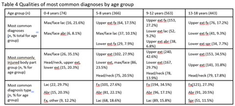 Detailed breakdown of most common primary diagnoses, injured body part groups, and injuries by age group over the study period. (Max/face: maxillofacial; ext: extremity; fx: fracture; lac: laceration; abr: abrasion; spr: sprain;