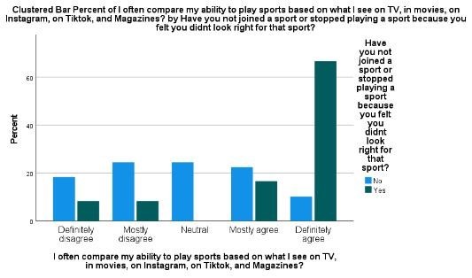 Table 1. Clustered bar percentage of survey response to questions; I often compare my ability to play sports based on what I see on TV, in movies, on Instagram, on Tiktok, and Magazines and have you not joined a sport or stopped playing a sport because you felt you didn't look right for that sport?