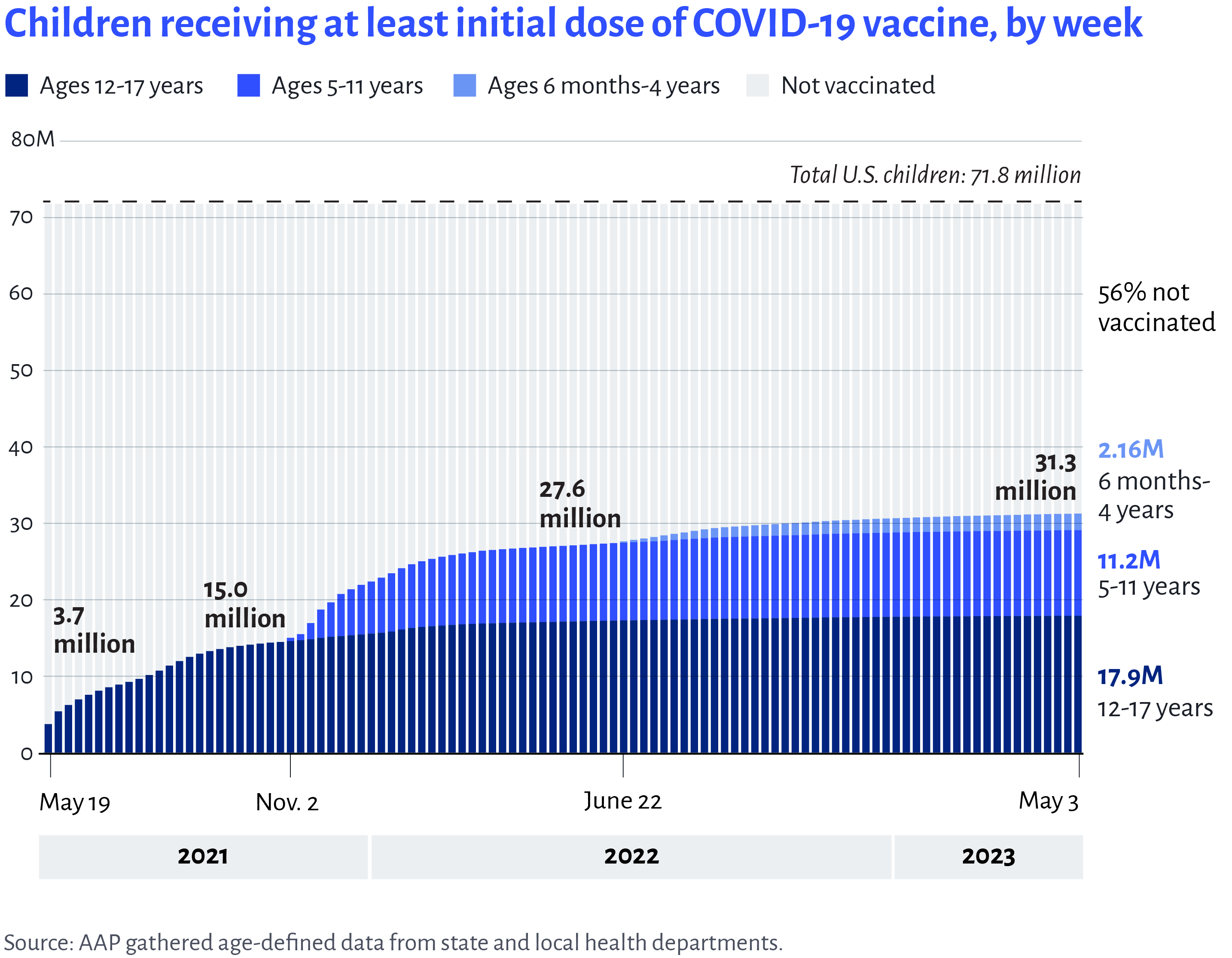 By May of 2023, 68% of children aged 12-17, 39% of children aged 5-11 and 13% of children aged 6 months to 4 years had received at least one dose of COVID-19 vaccine. Overall, about 81.4% of the U.S. population had gotten at least one vaccine dose.
