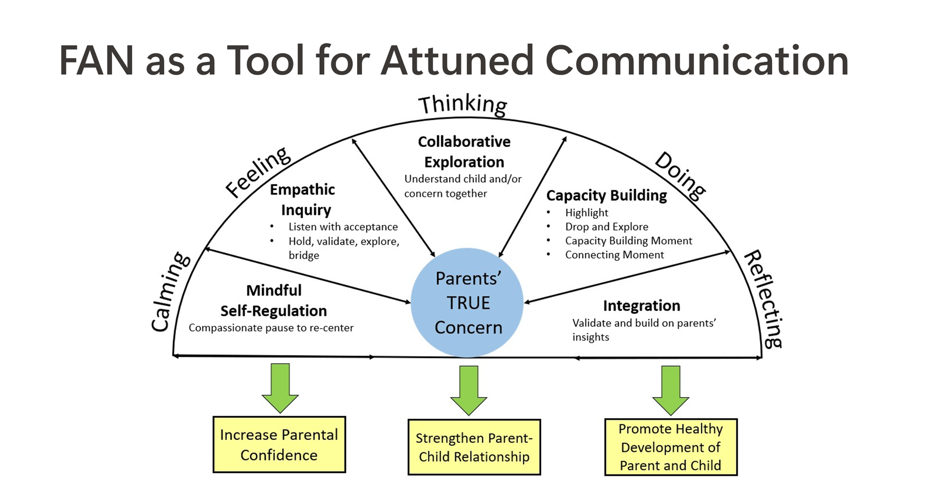 - FAN is a communication tool that is based on the concept of attunement; that is, if a parent feels connected to and understood by you, they are open to partnering with you. FAN operationalizes attunement by helping the physician read the parents’ communication cues, discover the parents’ true concerns and collaborate with them to address their concerns. FAN enhances physician self-awareness and well-being through reflective practices.