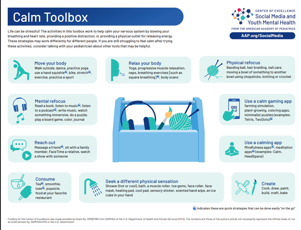 Our new Calm Toolbox suggests ideas and tools youth, and also parents, can try when feeling overwhelmed.