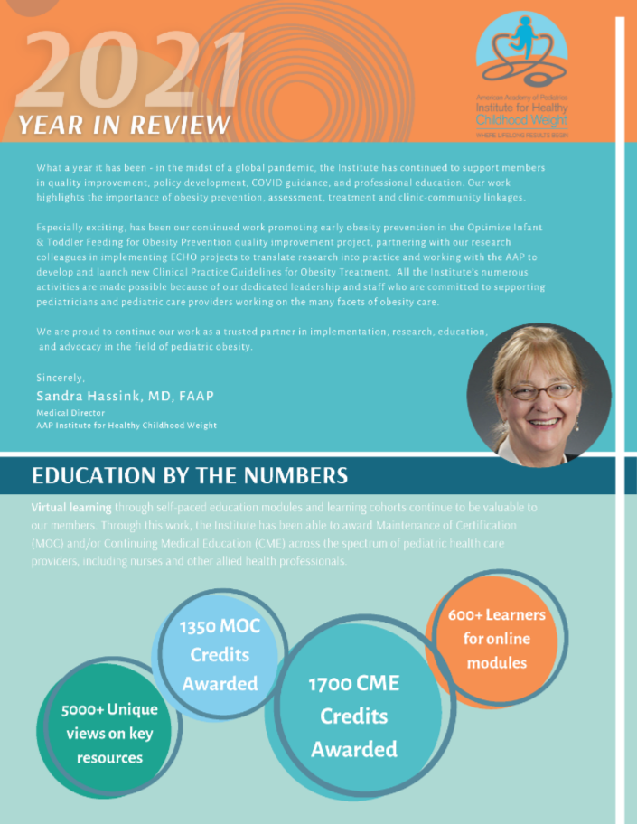 The Institute for Healthy Childhood Weight is excited to share some of our accomplishments and highlights with you. Below are the year in review summaries. Click on the image to download the full PDF year in review summary for that specific year.