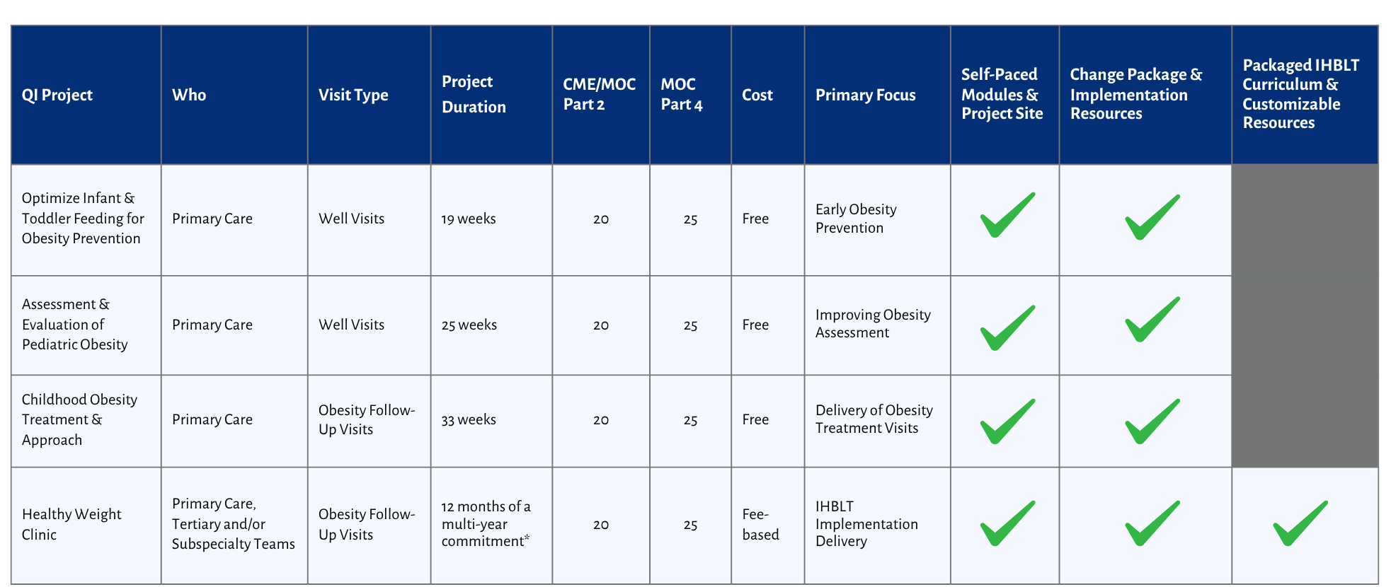 The Institute for Healthy Childhood Weight has been conducting quality improvement projects for over ten years and has successfully supported over 200 practice teams across the country through their quality improvement (QI) goals. In 2024 we awarded 1,460 MOC Part 2 credits and 1,580 CME credits to participants through our QI initiatives. Please complete the interest form to receive updates when projects are recruiting.