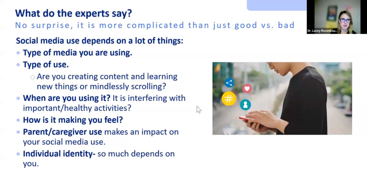 Are you looking for positive ways youth can use social media? In this webinar hosted by the National Council for Mental Wellbeing and the American Academy of Pediatrics Center of Excellence on Social Media and Youth Mental Health, Lacey Rosenbaum, PhD and two teen guest speakers describe the potential risks and benefits of social media use to teen mental health, identify healthy social media habits and discuss resources and strategies to support these habits. Share this recording with the young people in your life!