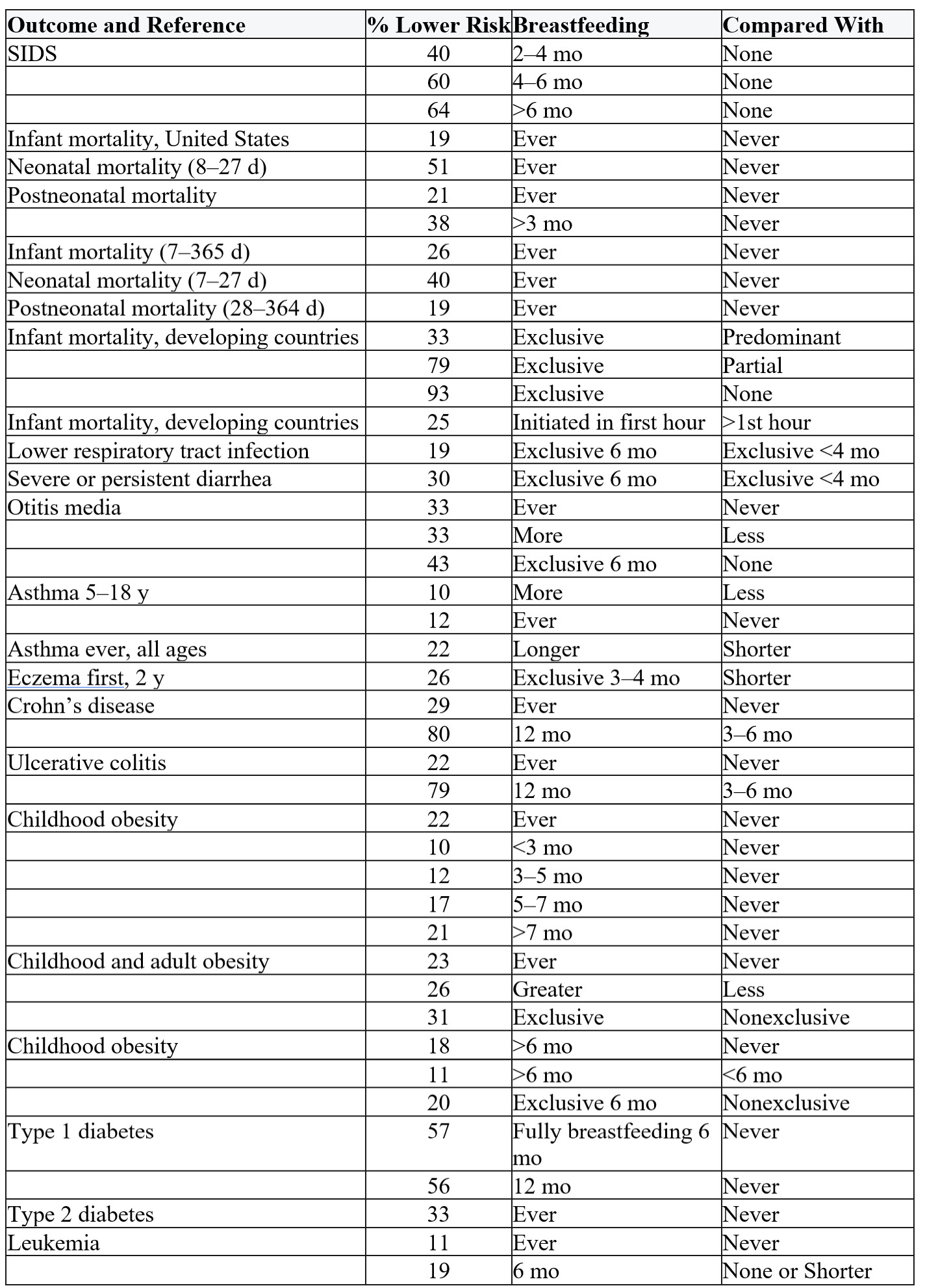 Six months of exclusive breastfeeding is associated with decreased rates of lower respiratory tract infections, severe diarrhea, otitis media, and obesity, among other outcomes.