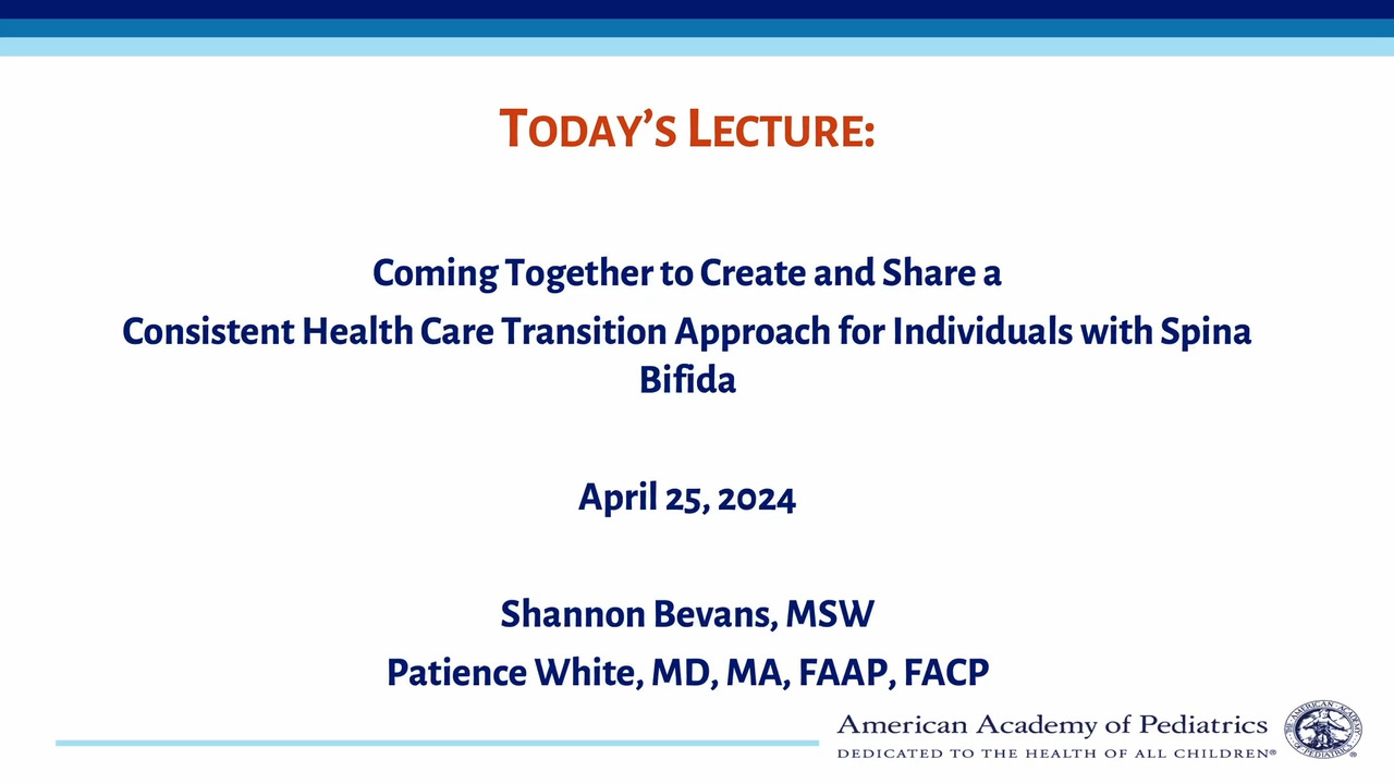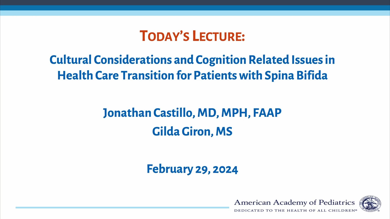 In the winter 2023-2024, a qualitative study was conducted to better understand the health care experiences of Latinos with spina bifida in accessing care for their condition, as well as the experiences of Latino parents/caregivers of individuals with spina bifida in accessing care for their family members with spina bifida. The following PowerPoint presentation, with speaker's notes, highlights these findings and can be used to better inform clinicians caring for this population on existing challenges and gaps in accessing care and providing recommendations to improve equitable care access.