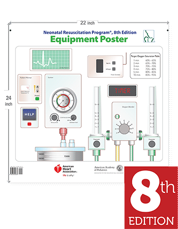 Simulate a realistic delivery room setting during your NRP training courses with the NRP Equipment Poster. Features images of a manometer, oxygen blender, pulse oximeter, and more.