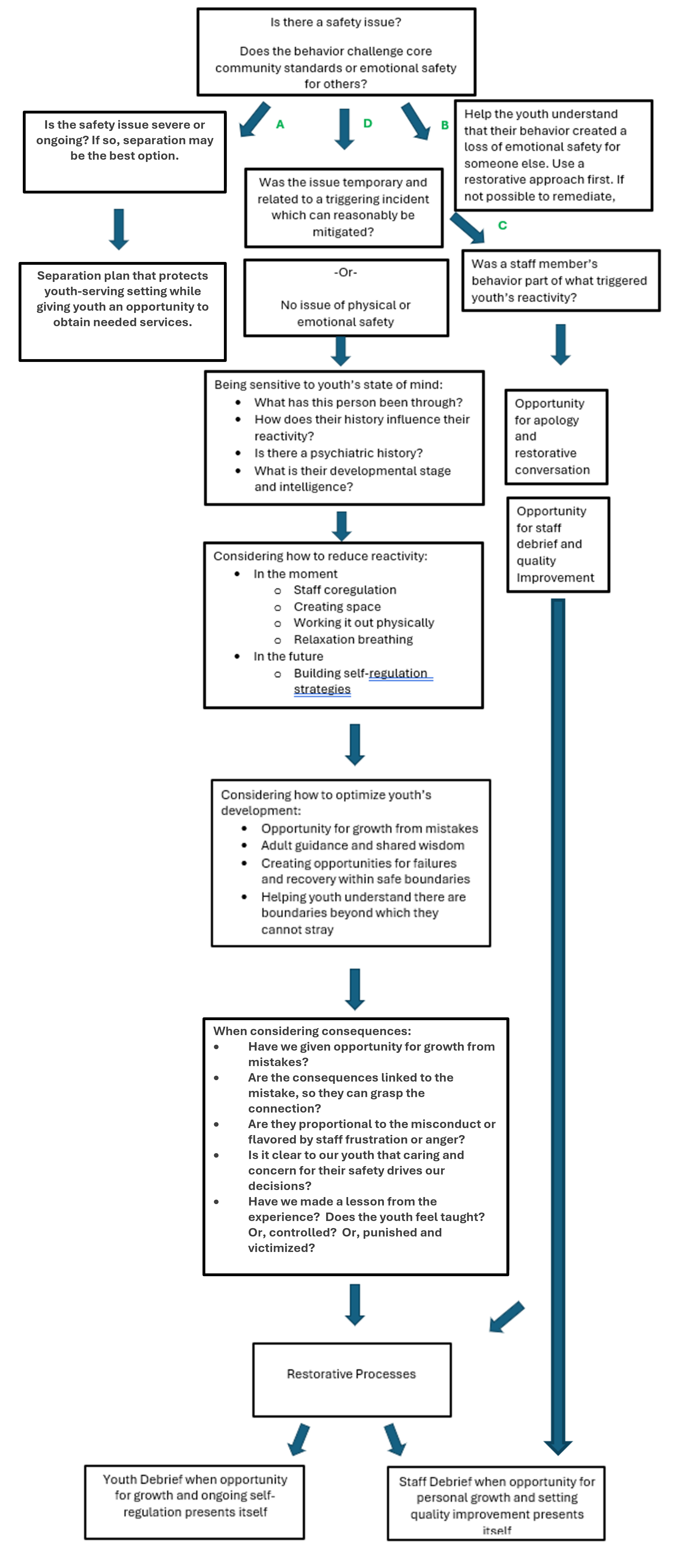 - Balancing Being Responsive and Trauma-Sensitive with the Need to Hold Youth Accountable in Response to an Incident (A flowchart depicting paths taken depending on the varied nature of the incident.)