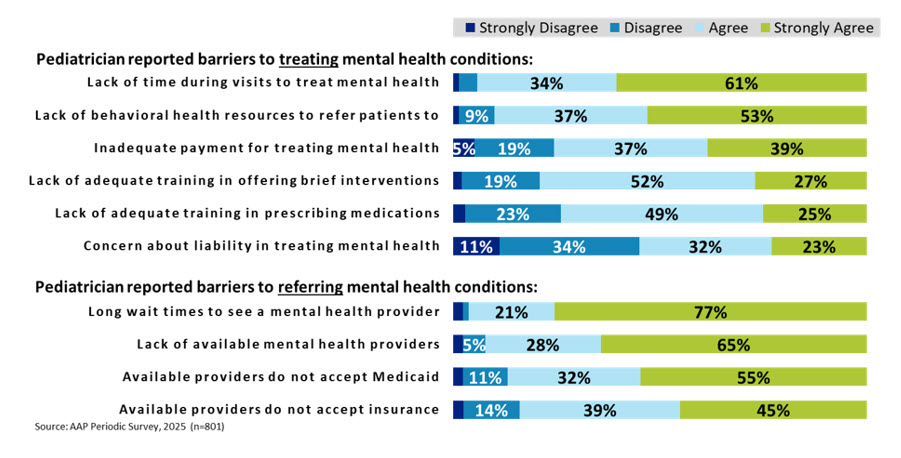 Methods: A 2025 AAP Periodic Survey, national random sample of non-retired US primary care AAP members, queried attitudes about anxiety and depression, frequency these conditions are identified in primary care and barriers to treating and referring mental health. Response rate was 46% (analytic n=801; includes those who provide health supervision). Chi-square examined associations between the top 3 reported barriers (strongly agree vs agree, disagree, strongly disagree) and practice characteristics.