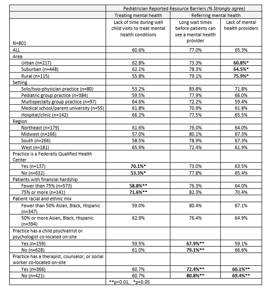 Conclusion: Primary care pediatricians reported commonly caring for patients with anxiety and depression. Barriers to managing patients with mental health conditions underscore the continued lack of access to [FAG3.1]mental health providers. Those with on-site mental health providers reported fewer barriers.