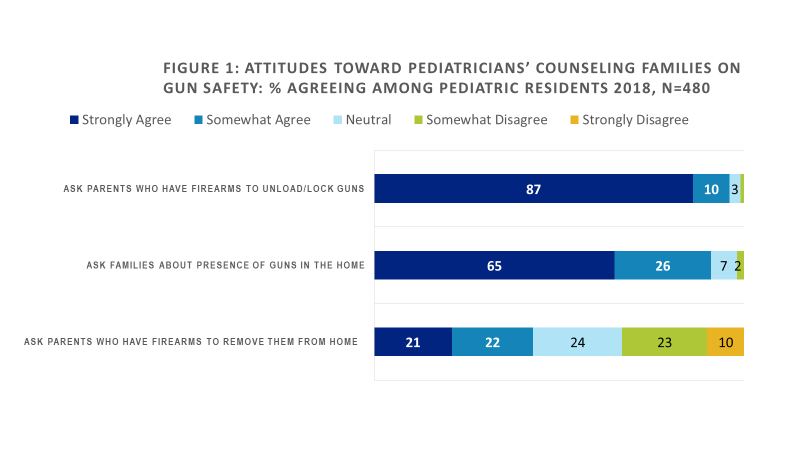 Conclusion: By completion of residency 7 of 10 pediatricians have direct experience with gun injuries. While personal background and geographic region shape attitudes on best approaches to reduce gun violence, large majorities believe pediatricians have a role in counseling families and support policies aimed at reducing gun injury for children.