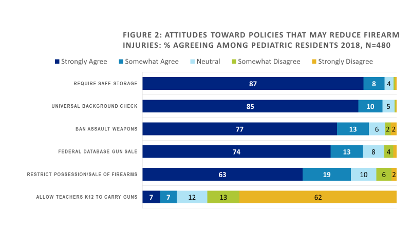 Results: 69% of residents report caring for gun injuries during training (median injuries=3). In their own background 30% grew up in a home with a gun. In attitudes toward counseling (Figure 1): 90% agree (strongly agree or somewhat agree combined) pediatricians should ask about the presence of guns in the home, 96% agree pediatricians should ask parents to unload/lock guns; and 44% agree pediatricians should ask parents to remove guns from the home. In attitudes toward public policy (Figure 2) high portions agree with policies such as universal background checks (95%) or banning assault weapons (90%), while few, (14%), support allowing teachers to carry guns in K-12. No attitude variations were found by whether the resident had treated gun injury. Few variations were found by gender. Support of public policies varied most by region of the country where trained and firearms in home growing up. For example, 98% in the Northeast, 93% in the West, 88% in the Midwest vs. 80% in the South support banning assault weapons (p <.001); 93% of those who grew up without a gun in the home vs 81% of those who did, support banning assault weapons (p<.001).