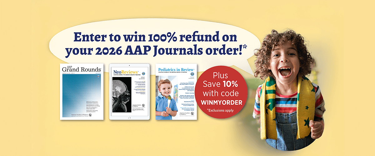 *100% refund offer details and exclusions: Offer is valid on individual AAP Journal subscriptions in any format including 2026 AAP Grand Rounds, 2026 Pediatrics in Review or 2026 NeoReviews. Offer does not apply to other products, books, subscriptions packages or bundles with PREP products. This offer does not apply to previously purchased 2026 AAP journal subscriptions and cannot be combined with any other offer or promo code. One winner will be randomly selected from all purchasers of a 2026 AAP Journals subscription using the promo code WINMYORDER through March 31,2026. The refund provided to the winner will correspond to the individual subscription rate paid at the time of purchase, not to exceed a maximum of $700. Winner will be selected in April 2026.