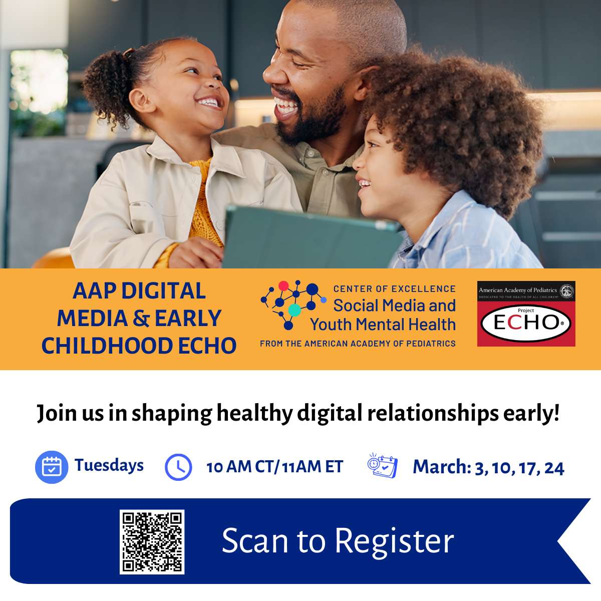 The AAP welcomes you to join the Digital Media & Early Childhood ECHO! This program brings together clinicians, educators, childcare providers, and professionals working with young children (infants to 5-year-olds) to explore how digital media impacts early development and discuss how to support families in building healthy, balanced media habits from birth. Each session of this free 4-part series consists of a short lecture followed by a group discussion.